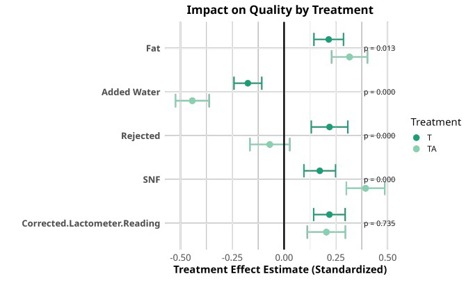 The significant increase in quality contrasts with a lack of impact on prices at both the MCC and farmer levels. Despite improvements in milk quality, processors continued to offer uniform prices, undermining the financial incentives for farmers to invest in quality enhancements. Even with stricter quality standards at treatment MCCs, there was only a marginal increase of about 1.5% in farmer-reported prices, which is unlikely to drive substantial behavioral change.